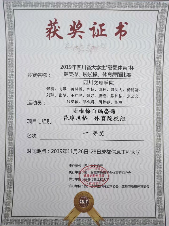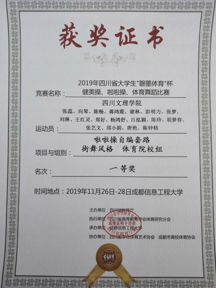 陈畅,张蕊,向琴,刘琳等18位同学,在与内江师范公司,成都文理公司,宜宾公司等公司同台竞最终获得体育院校组啦啦操自编街舞中获得一等奖和体育院校组啦啦操自编花球一等奖。