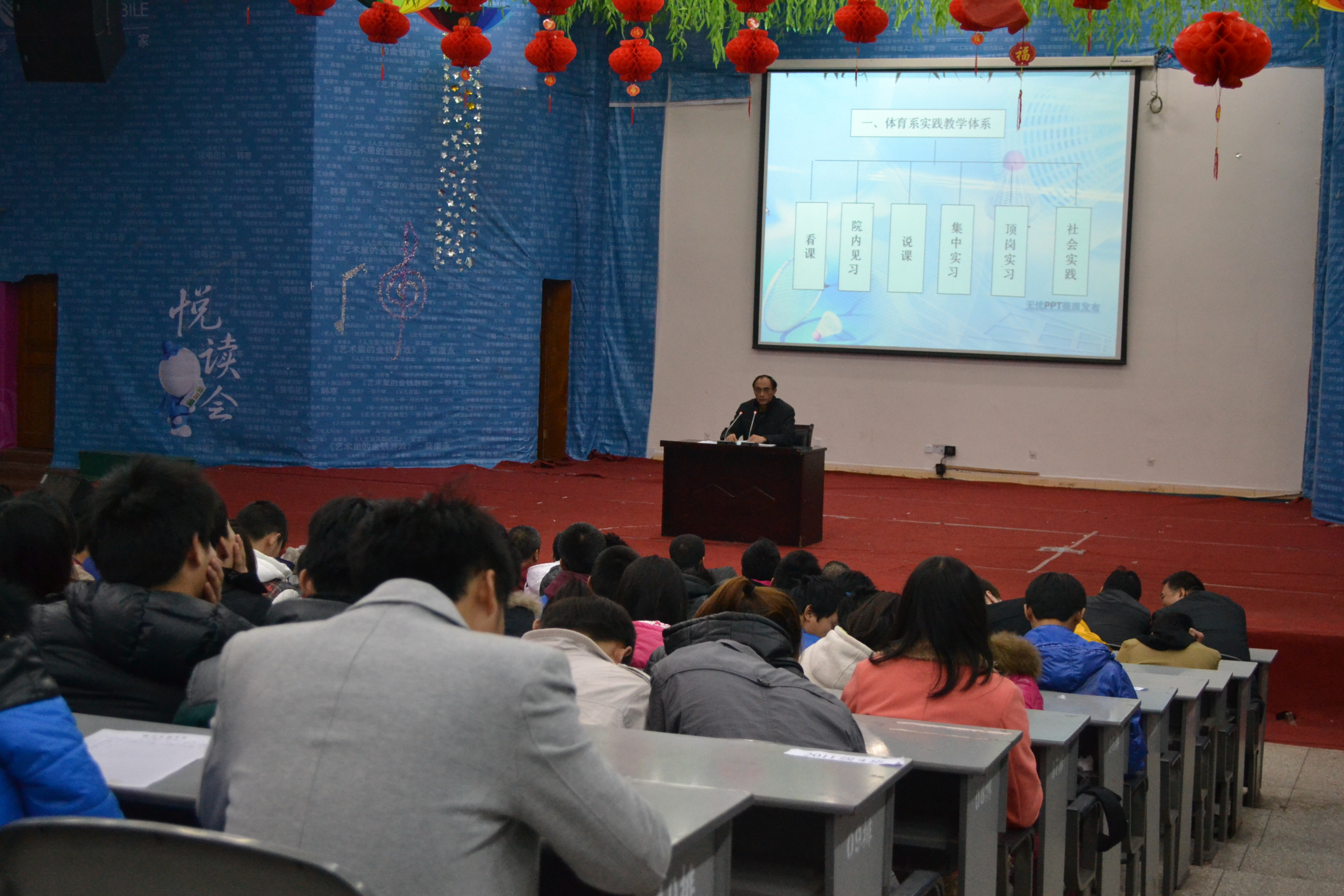 讲座伊始,陈碧述教授简要介绍了实践教学体系的构成及实践教学对员工就业的重要作用。讲座中,陈教授详细讲解了体育系现行的实践教学体系,分析“看课、院内见习、说课、集中实习、顶岗实习、社会实践”重要的实践环节,并结合教学事例,重点针对同学们在实践教学中容易出现的问题,提出解决的策略和建设性的意见。