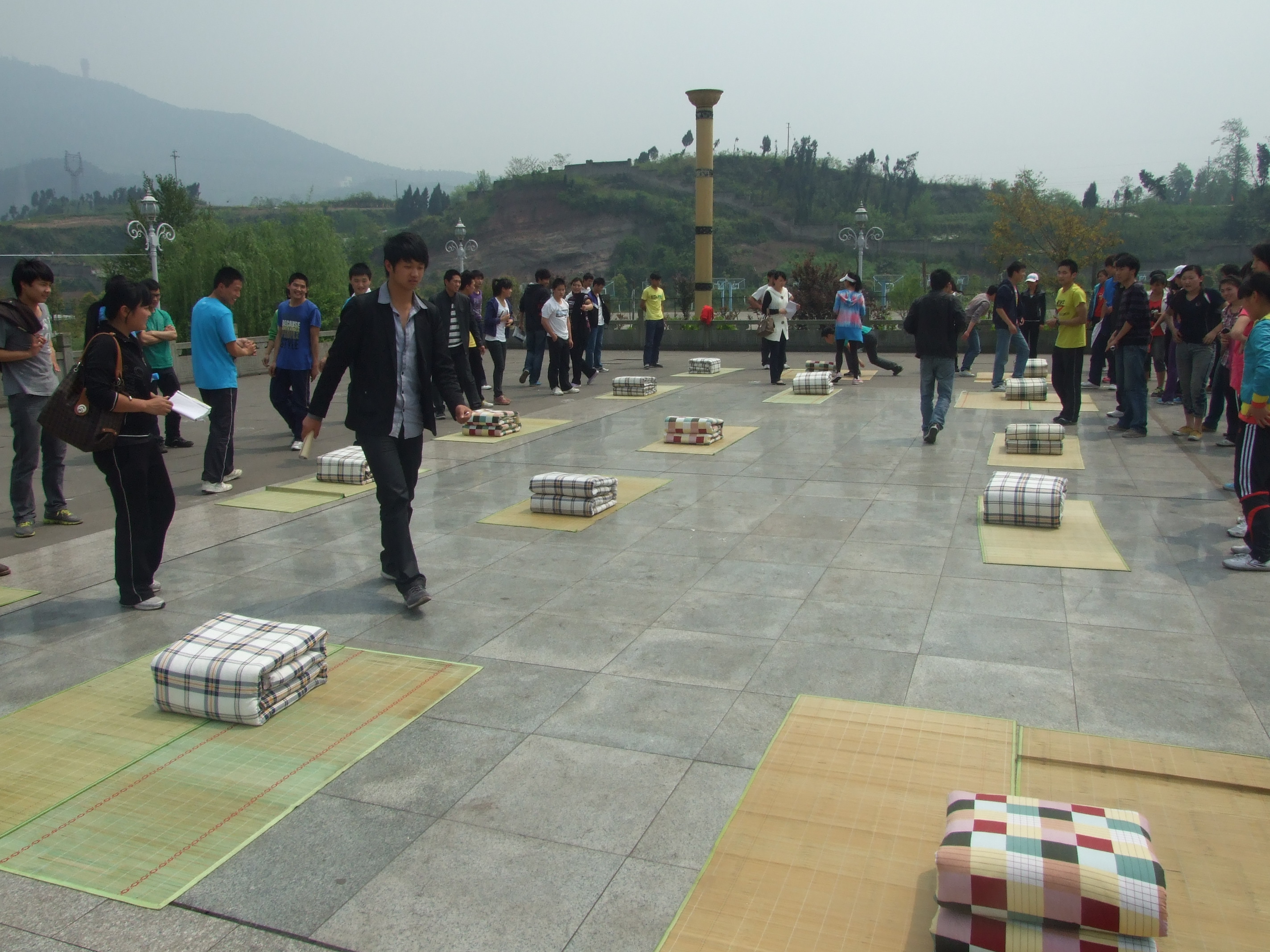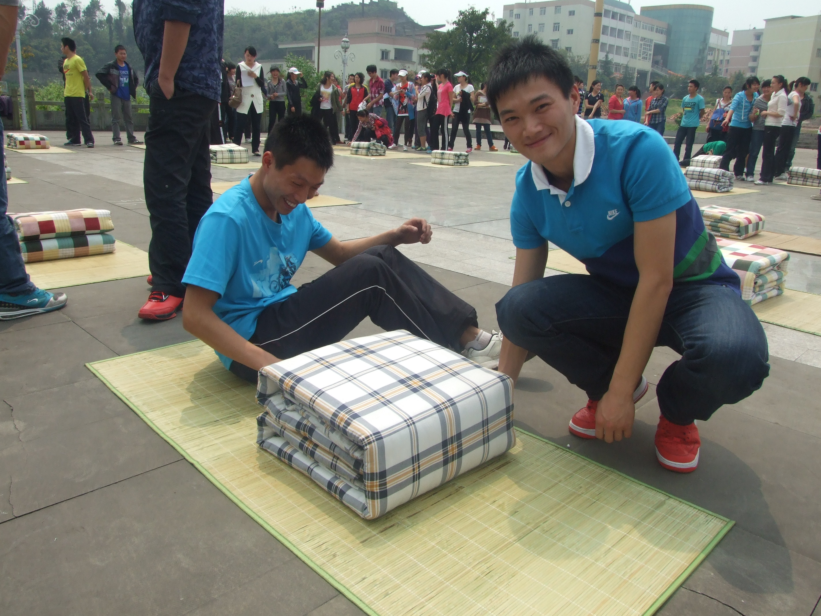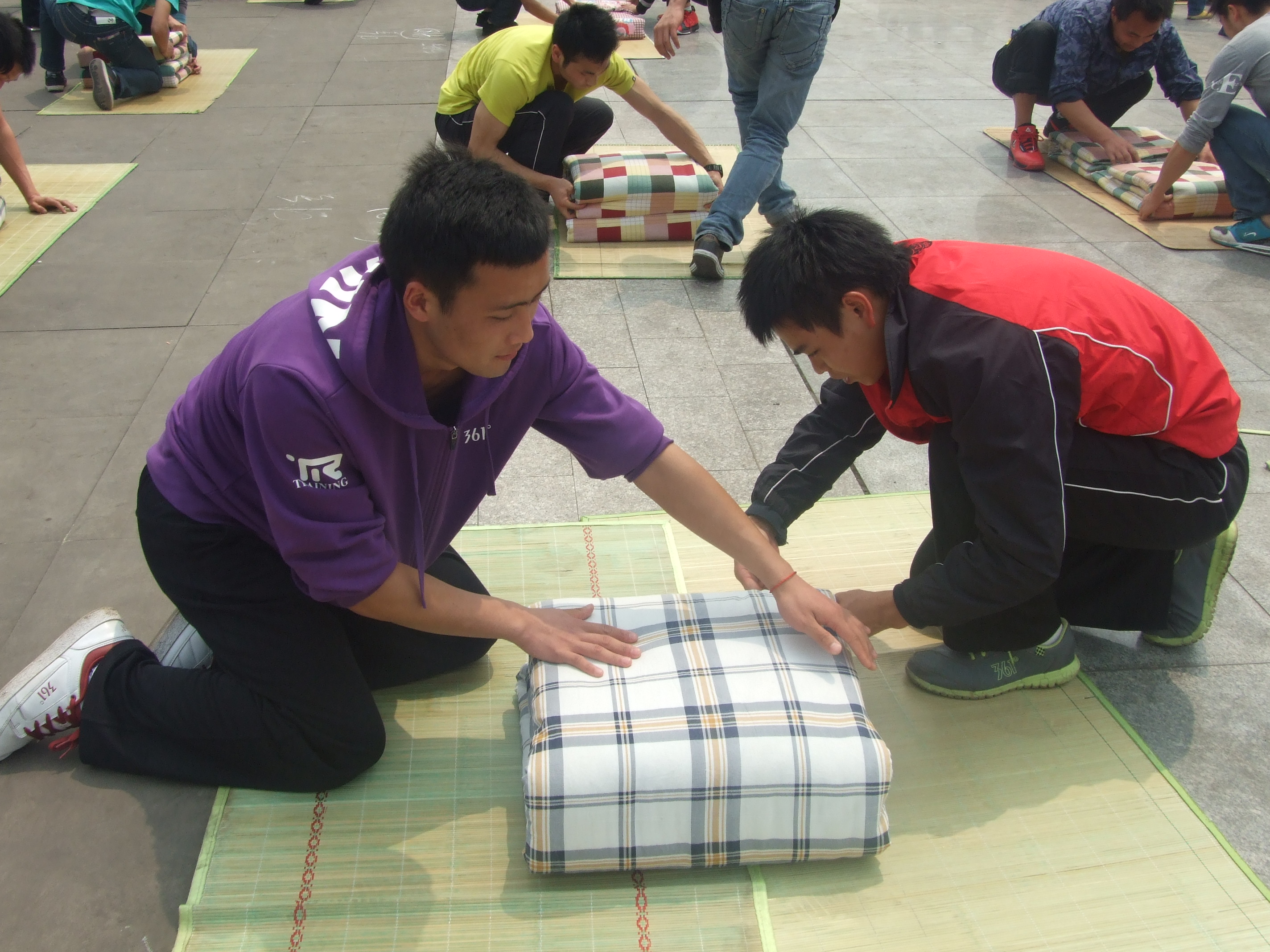 我系在公司人工湖广场举办的叠被大赛,虽炎炎烈日,但同学们的热情高涨。通过初赛和决赛,被子叠放整齐受到辅导员老师和同学们一致好评的寝室有:女生六舍302、313、314、315、407;男生九舍405、419、420、502;男生十舍406、506、512、516、614。最终,得分最高的四个寝室,女生六舍314、315;男生十舍406、506将代表体育系参加公司的叠被子比赛。