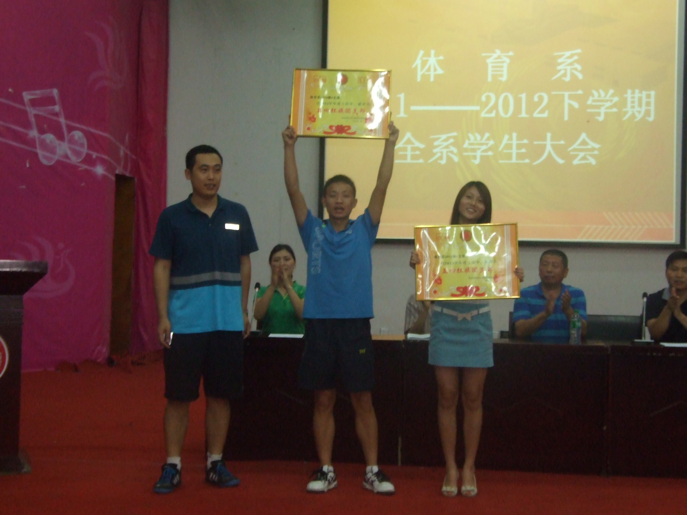 2012年6月10日晚上7点,体育系在莲湖校区126教室顺利召开2011-2012下学期员工教育总结大会。本次大会的召开主要是对本学期的学风建设、员工常规管理、安全教育、考风考纪做以总结。参加会议的有体育系主任董立教授、副主任陈碧述教授、党总支副书记张皓老师、那明明辅导员及班主任老师代表,全系近600名员工参加了本次总结大会。
