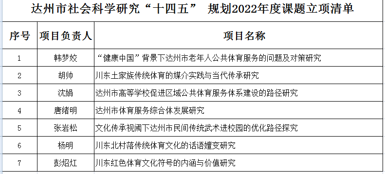 近日,达州市社科联发布了达州市社会科学研究“十四五”规划2022年度课题立项通报,据统计,K1体育教师共立项课题7项。具体立项名单请参见下表。请各位立项项目负责人认真做好项目研究工作,确保立项按时保质完成。