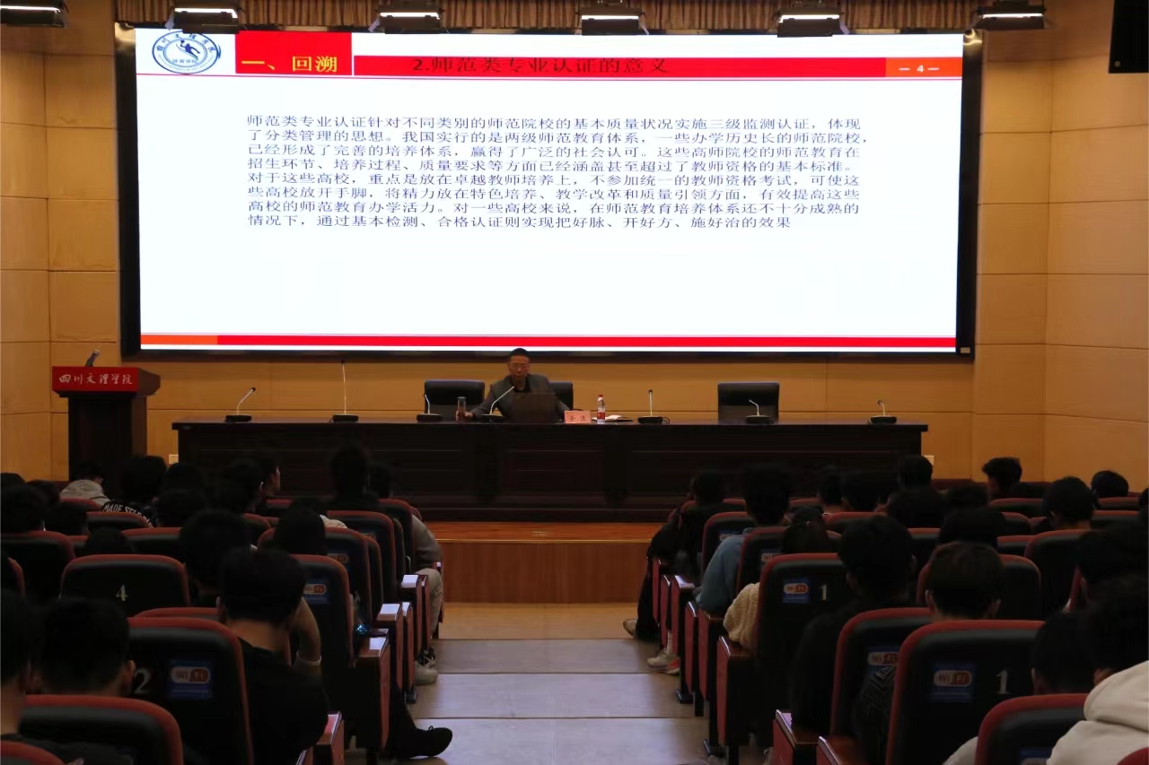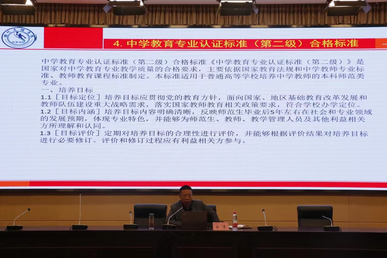 最后,孙亮亮教授做了总结发言。他指出,佘涛教授治学严谨,讲座内容丰富,理论联系实际,对当前的认证工作极具指导意义。他强调,师范专业认证既是对我们专业的一次体检,也是专业发展的一次指导,全院师生要站在公司发展和提升人才培养质量的高度,重视和参与认证工作。