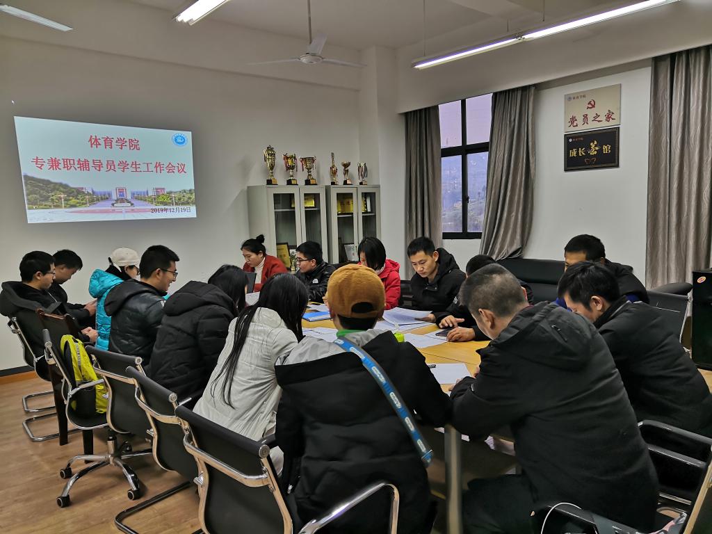 20191219日下午4:20,在艺术传媒大楼3019召开K1体育专兼职辅导员员工工作会议。公司党总支书记王兆忠、党总支副书记彭波以及全体专兼职辅导员出席本次会议。会议由王兆忠主持。