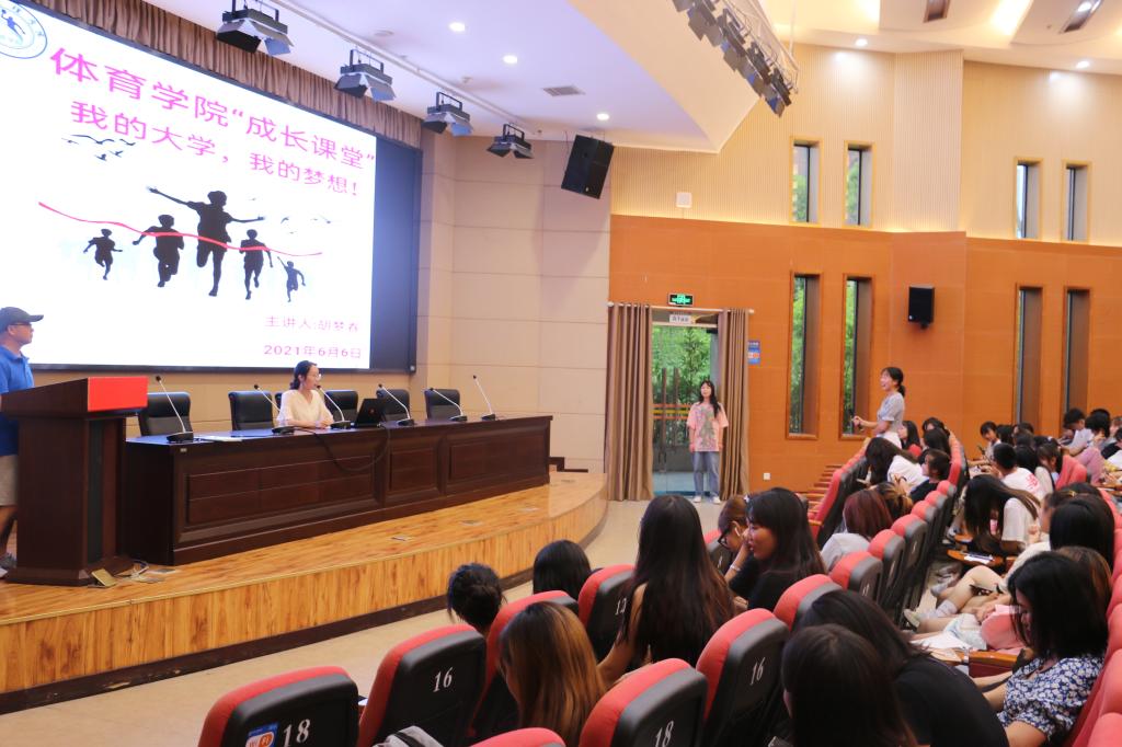 胡梦春为大家讲述了自己体育学习之路、考研奋斗历程。她谈到,在高中阶段一次偶然的机会,文化成绩较好的她成为了体育生。由于高考失利,刚进大学时自己情绪有些低落。后来在老师的引导下、师兄师姐关心下,她逐渐发现了文理校园的魅力,渐渐调整了心态,并且将精力慢慢转向了健美操专项学习。专项学习非常辛苦,但她一直坚持了下去。参加了许多国内健美操比赛,游历不少城市,拓展了视野,洗去了训练的艰辛,收获满满。她认真对待理论课程学习,总是坐在教室第一排,刻苦学习所学科目成为了常态和习惯。从未参加任何培训班,顺利通过了大学几乎所有专业过级考试。给自己压力,心怀梦想,坚持为理想而奋斗。当选择了考研,她就一刻没有停止过努力。尽管临时更换了公司、更换了备考内容,她仍然克服了困难,用辛勤努力实现了梦想,就如她所说到“这段时间很痛苦,但是很有意义。结果是美好的,我如愿的考上了”。她还现场回答了同学们提出的有关学习、考研和老员工活的问题。课堂上,胡梦春用流行时尚的网络词、幽默含蓄的话语、真切详实的个人经历,引起了听者的共鸣,给大家带来了一场成长的“盛宴”。